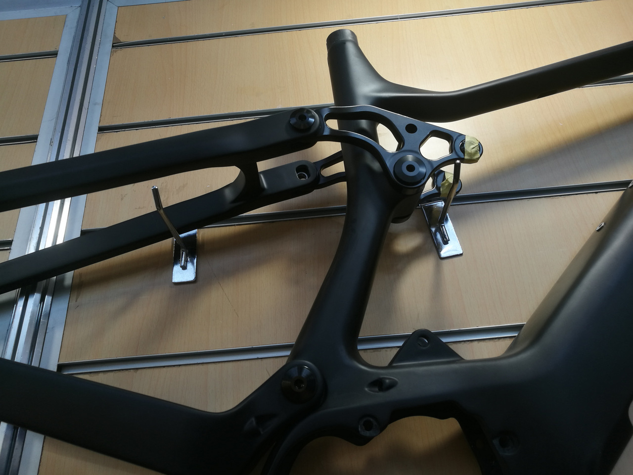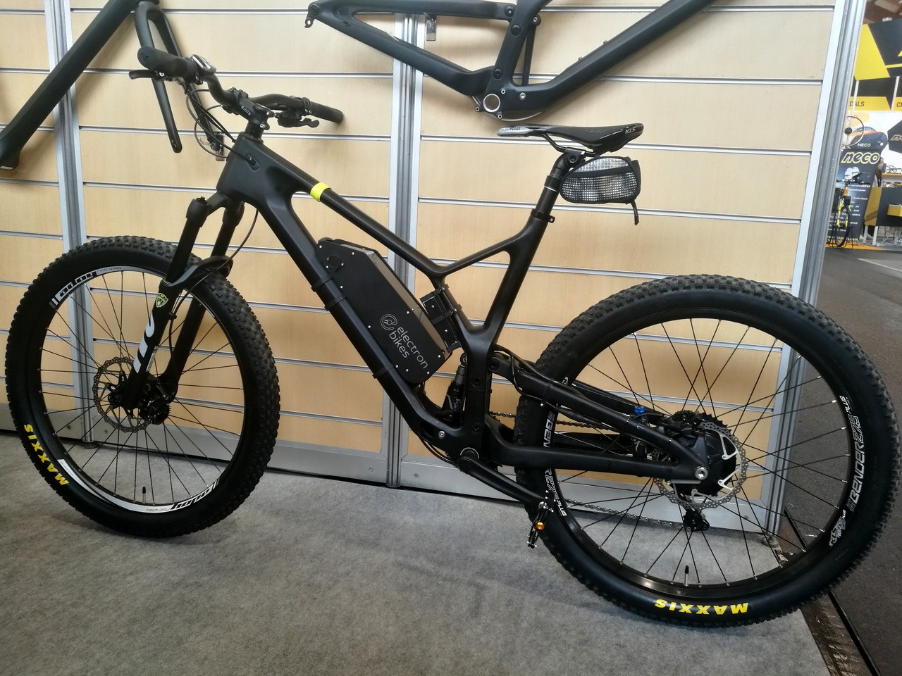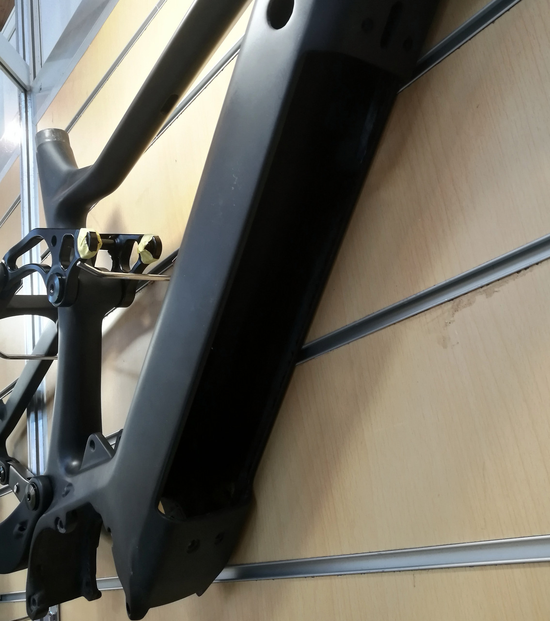 最后的重頭戲來了,看看這輛“魔改”的M06,這是祺洋航的一款高性能林道自行車,設計非常激進和超前,包括取消后轉點(通過碳纖形變),使用分叉式立管,全碳纖維連桿,五通處凹槽容納后避震器。這輛車已經被改成電助力,使用后花鼓電機,電池模組直接固定在下管,控制盒安裝在立管和上管的連接處,看上去非常和諧。此外還能看到它使用了一個帶brain的后避震器,不得不佩服車主的動手能力,不過也印證了祺洋航車架的強度和剛性(一般電助力都要增加車架強度)。