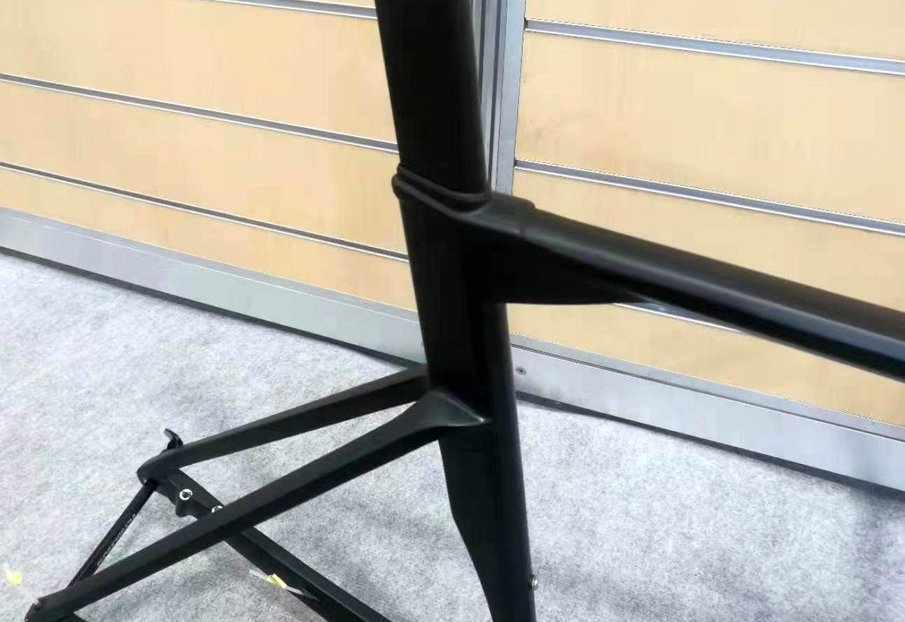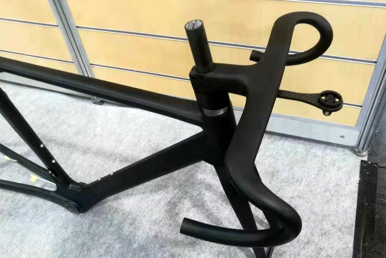 整合設計是目前公路車的一個發展趨勢,祺洋航也推出了解決方案,這輛氣動公路車使用一體車把/把立,線管通過車把、把立、頭管到車架。包括碗組墊圈都是氣動外形,車把前面提供了前伸式碳纖碼表座。相對于祺洋航的明星產品R02,這款車架的管形更加纖細,特別是減少了立管的深度,因此它的舒適性也更好。目前氣動公路車和爬坡公路車越來越融合,不再是一味追求氣動性,而是在輕量和舒適性上更進一步。
