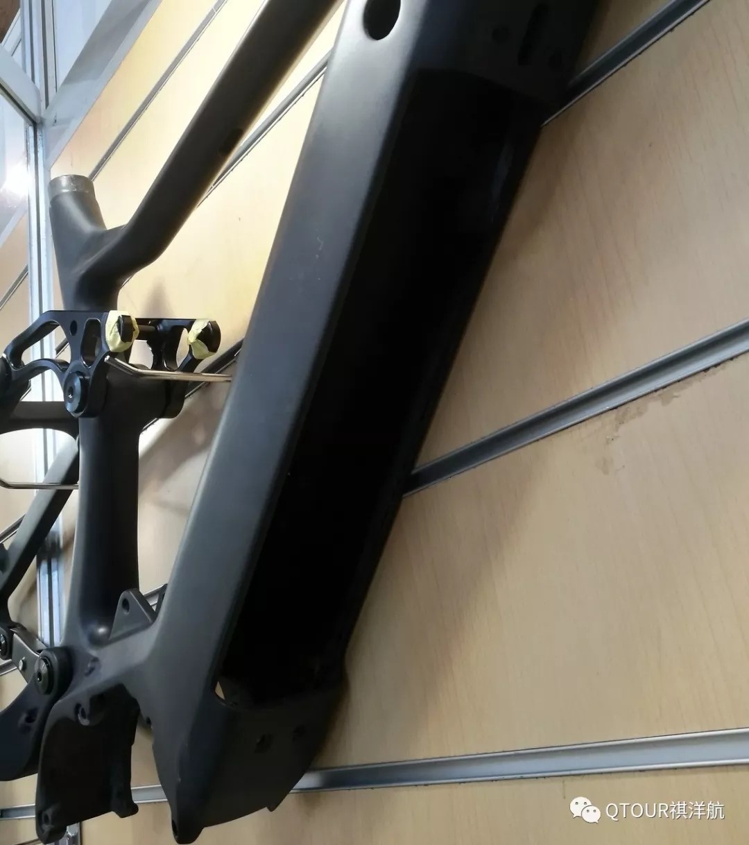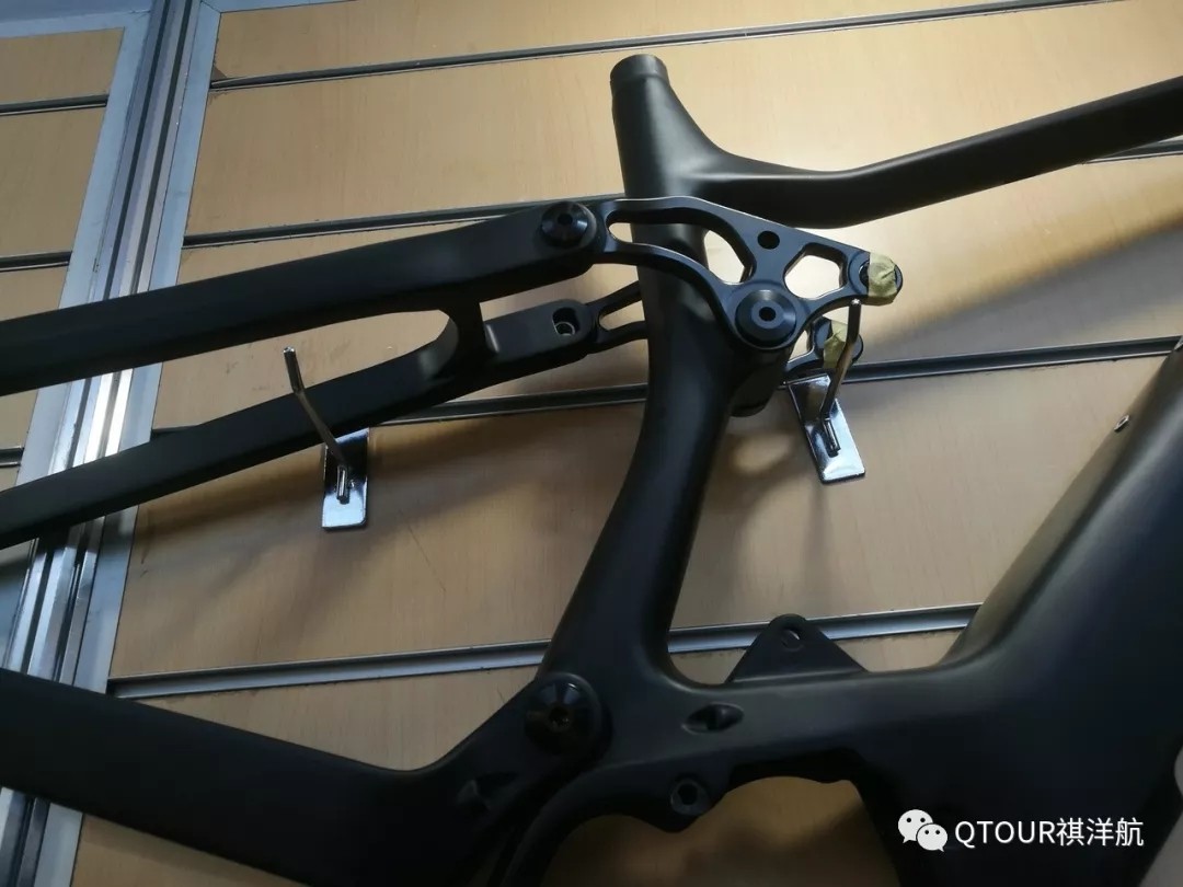 最后的重頭戲來了,看看這輛“魔改”的M06,這是祺洋航的一款高性能林道自行車,設(shè)計(jì)非常激進(jìn)和超前,包括取消后轉(zhuǎn)點(diǎn)(通過碳纖形變),使用分叉式立管,全碳纖維連桿,五通處凹槽容納后避震器。這輛車已經(jīng)被改成電助力,使用后花鼓電機(jī),電池模組直接固定在下管,控制盒安裝在立管和上管的連接處,看上去非常和諧。此外還能看到它使用了一個帶brain的后避震器,不得不佩服車主的動手能力,不過也印證了祺洋航車架的強(qiáng)度和剛性(一般電助力都要增加車架強(qiáng)度)。