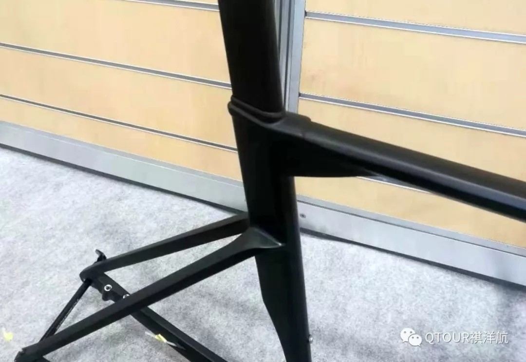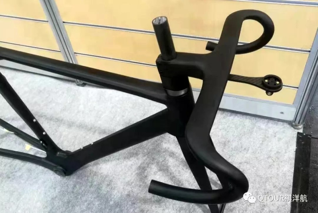 整合設(shè)計(jì)是目前公路車的一個發(fā)展趨勢,祺洋航也推出了解決方案,這輛氣動公路車使用一體車把/把立,線管通過車把、把立、頭管到車架。包括碗組墊圈都是氣動外形,車把前面提供了前伸式碳纖碼表座。相對于祺洋航的明星產(chǎn)品R02,這款車架的管形更加纖細(xì),特別是減少了立管的深度,因此它的舒適性也更好。目前氣動公路車和爬坡公路車越來越融合,不再是一味追求氣動性,而是在輕量和舒適性上更進(jìn)一步。